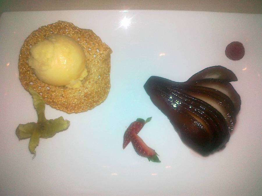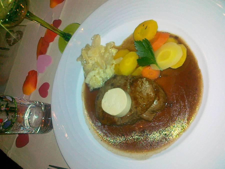 Florian nám doporučil restauraci L'Arbre Vert, kterou bych zařadil do kategorie venkovského kandidáta na michelinskou hvězdu. Ve skromném avšak útulném interiéru jsme se pokusili získat jídelní lístek (oni francouzsky - my anglicky). Z úvodního dialogu jsme pochopili, že mají pouze 3-chodové valentinské menu. Měli jsme však hlad a tak jsme objednali. Obrázky níže dokumentují dobroty, kterými nás postupně pohostili - filet s celerovým pyré, steak s omáčkou foie gras a na závěr gratinovaná hruška se zmrzlinou. Dobrota!